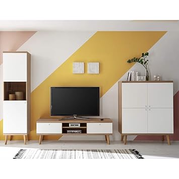 Kleine Wohnwand Weiss Eiche Retro Design Wohnzimmer Anbauwand